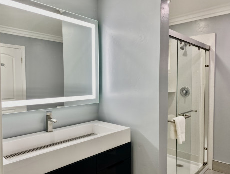 Our two room king suite features one king bed in the front room, and another king bed in a separate bedroom in the back and comfortably accommodates up to four guests. Both rooms feature walk-in closets, seating areas, and work desks. The non-smoking two king suite includes complimentary WiFi, a microwave and refrigerator, a coffee machine, a flat-screen TVs, premium cable channels, telephones, complimentary local calls. The private bathroom includes soft towels, hair dryer, and complimentary toiletries.